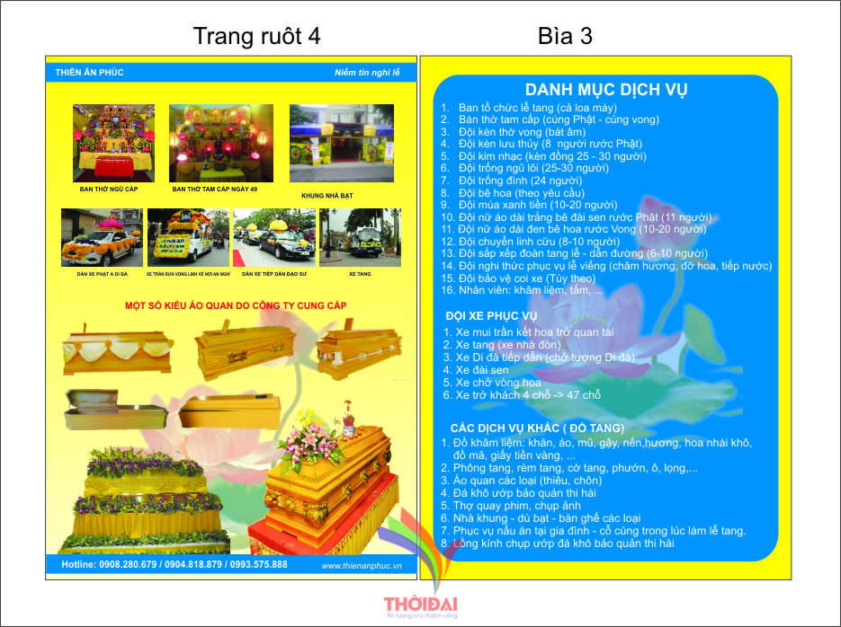Công ty THIÊN ÂN PHÚC ban hành và in ấn tập tài liệu giới thiệu cô đọng về Công ty và các danh mục dịch vụ LỄ TANG mà Công ty hiện đang cung cấp cho các Gia đình và xã hội.